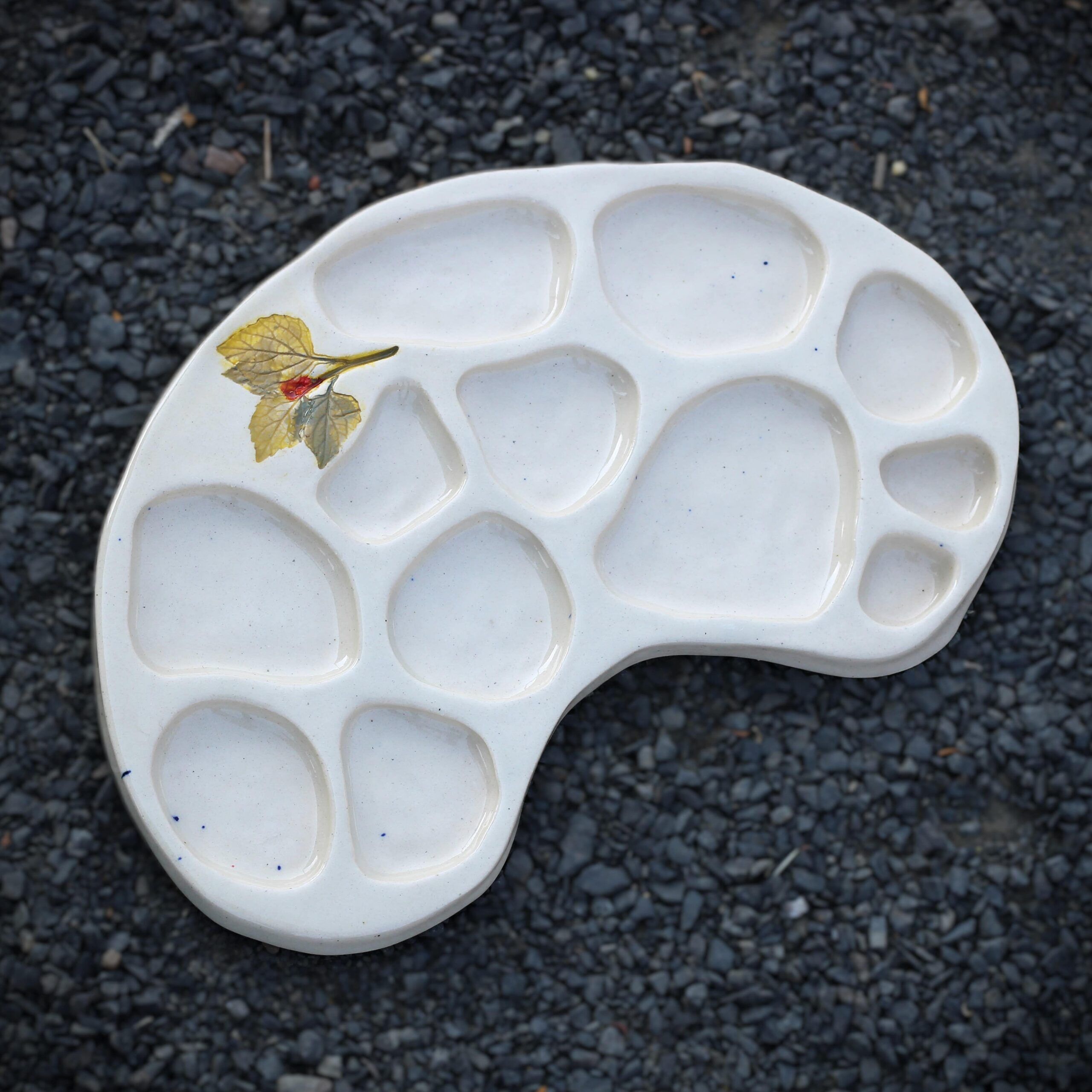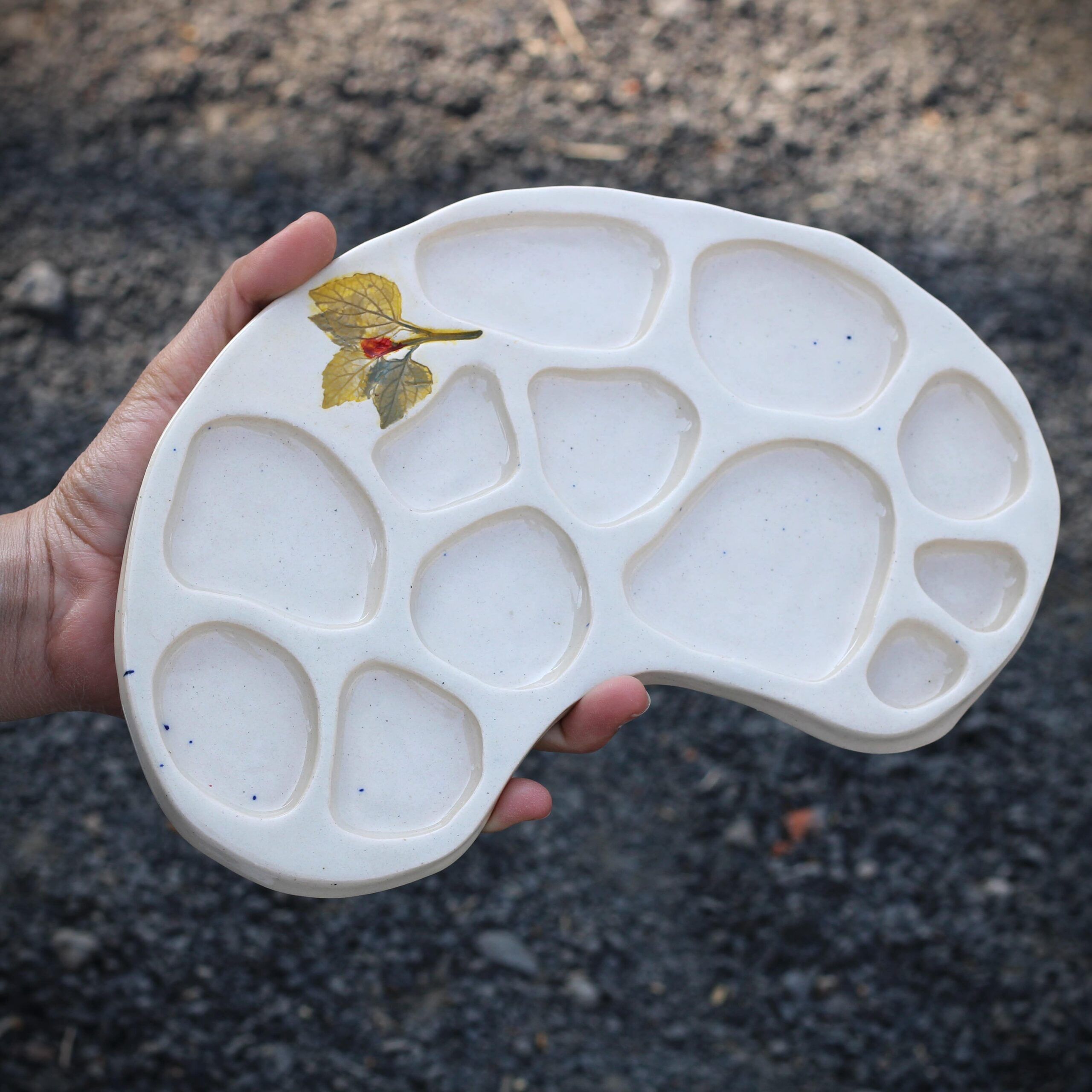 Nature-inspired, handmade ceramic palettes with real leaf impressions—easy to clean, scratch-free, and perfect for vibrant colors.